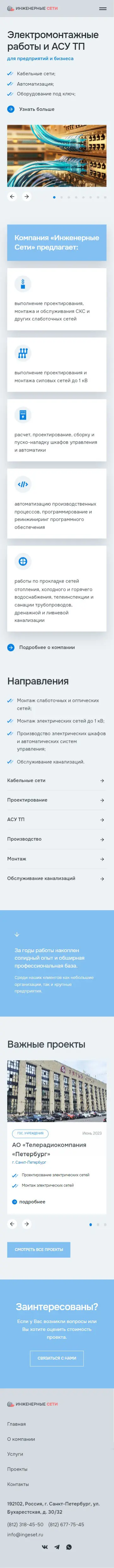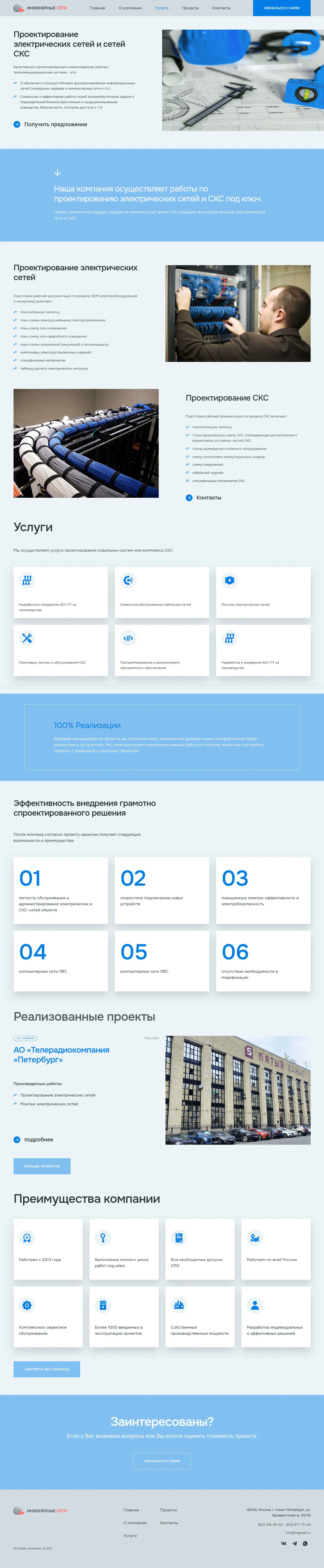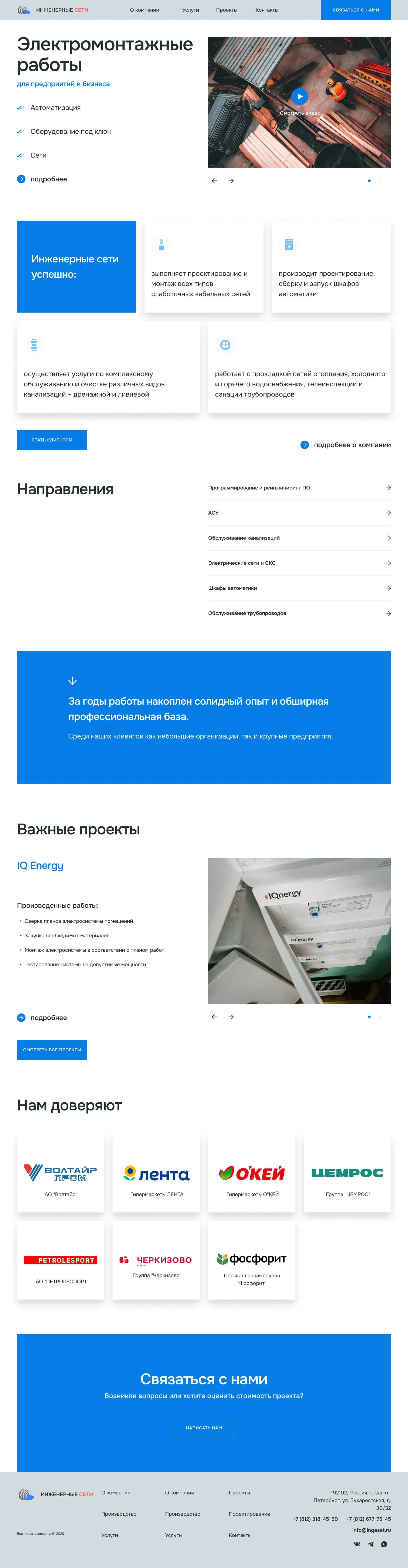 В процессе разработки дизайна проработали основные макеты — несколько услуг, главная, все сервисные страницы (о компании, контакты, проекты и карточка проекта). На этот объем у нас ушло также 20 рабочих дней.