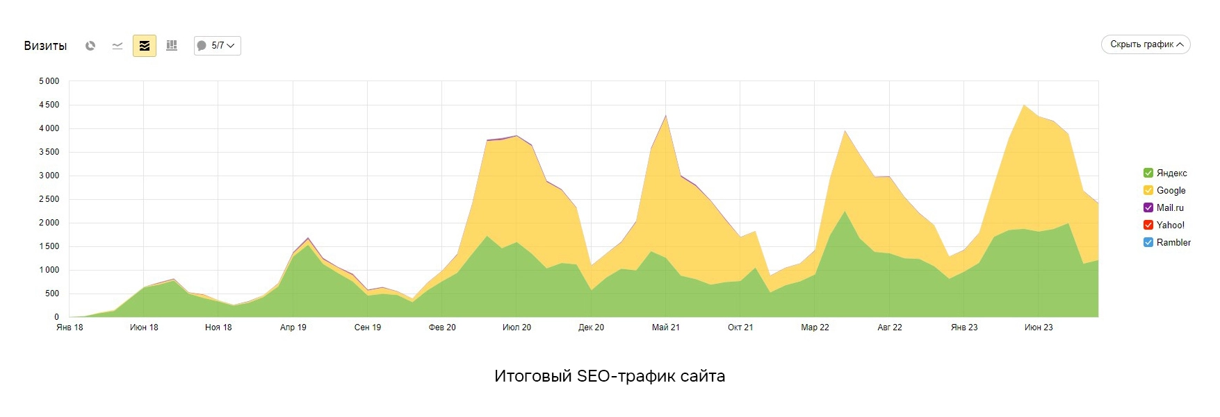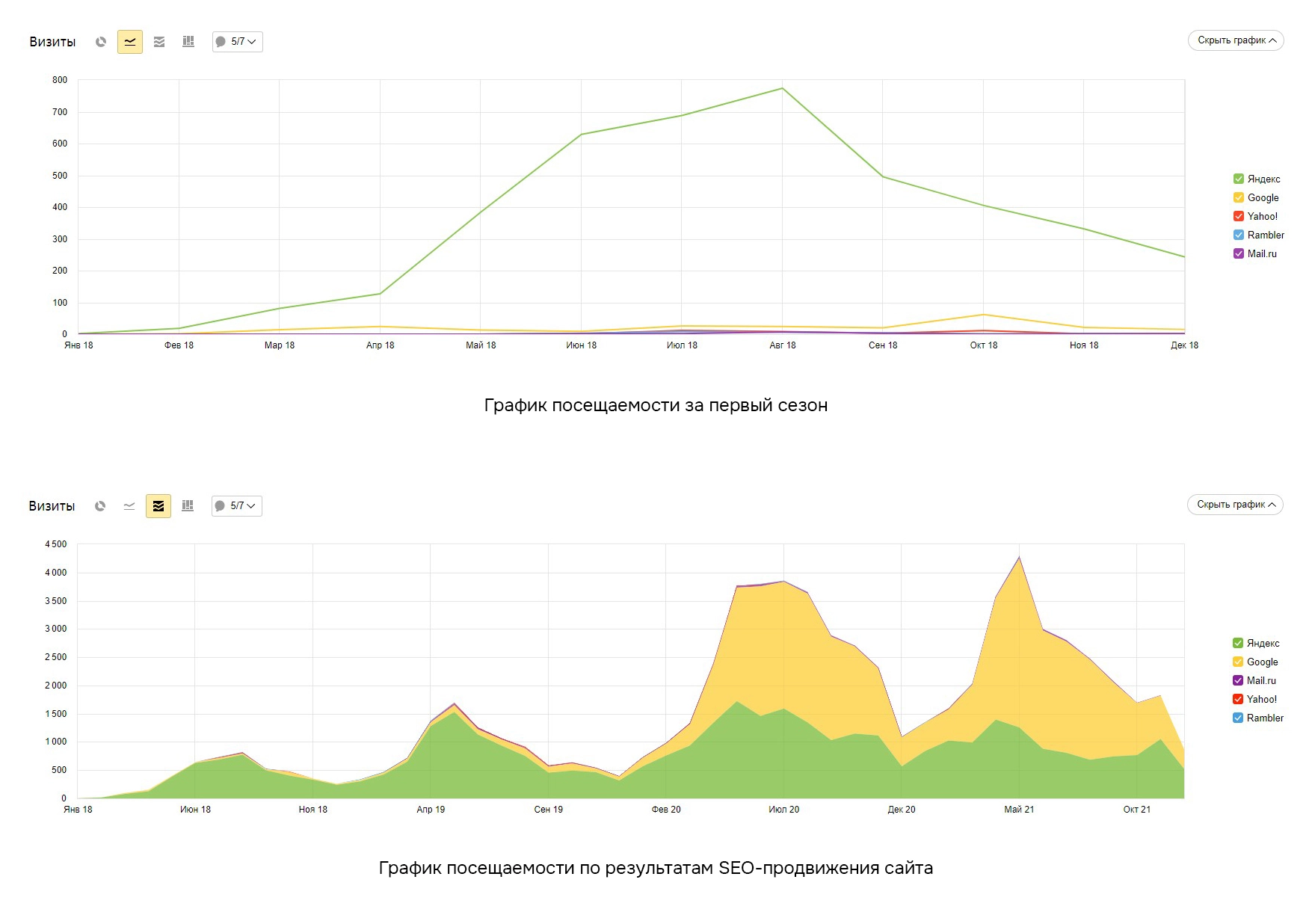 - Объем трафика в сезон — 150+ посещений ежедневно